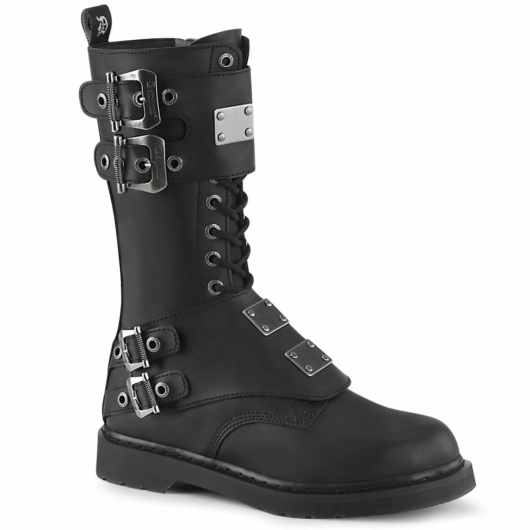 14 Eyelet Unisex Mid-Calf Combat Boot Featuring Buckled Panels with Metal Plate Center