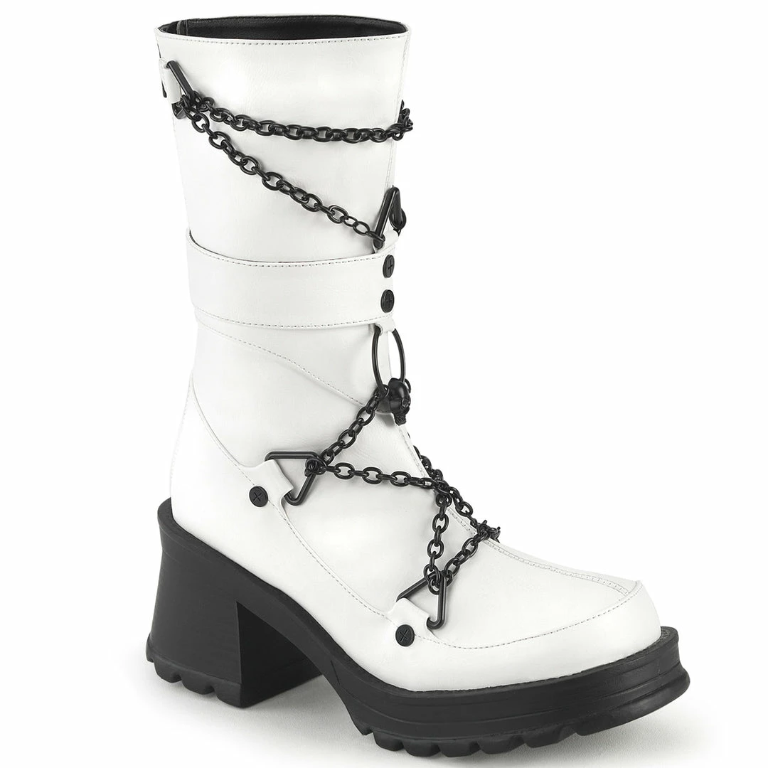 Platform Mid-Calf Boot, Featuring Pyramid Ring, Screw Studs, Hanging Skull O-Ring and Metal Chain Detailing on the Vamp Back Metal Zip Closure