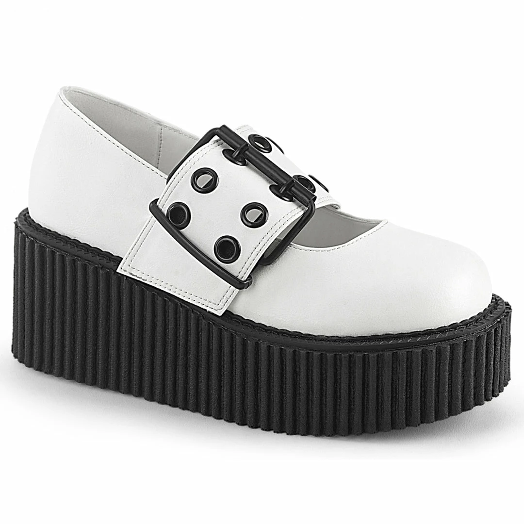 White Maryjane Creeper Featuring A Wide Grommeted Buckle Strap