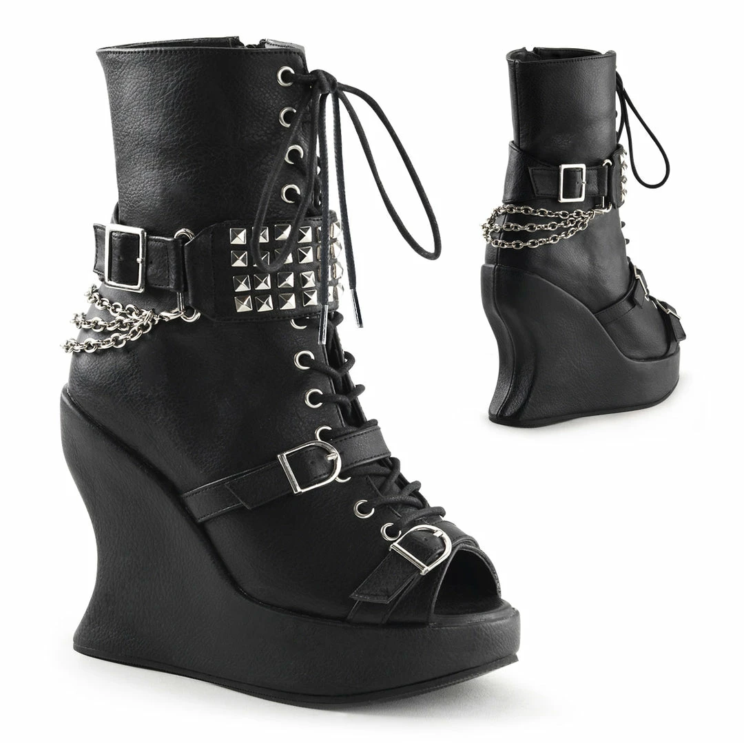 Platform Wedge Lace Up Calf High Gothic Boot with Buckles, Pyramid Studs & Chains,