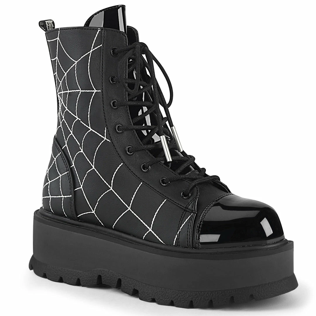 Platform Lace-Up Front Ankle Boot Featuring Embroidered Spider Web Detail