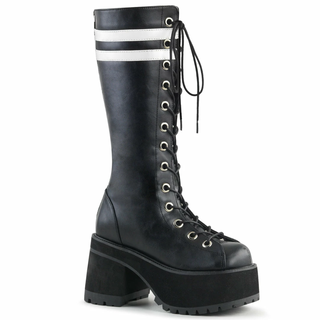 Platform Lace-Up Front Knee Boot withβΒ Two Contrasting White Stripes at Top