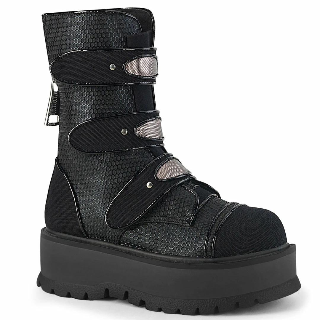 PlatformΓ’β¬Ε‘ΓΒ Lace-Up Front Mid-Calf Boot Featuring 3 Touch Fast Straps with Stud & Metallic Oval Details