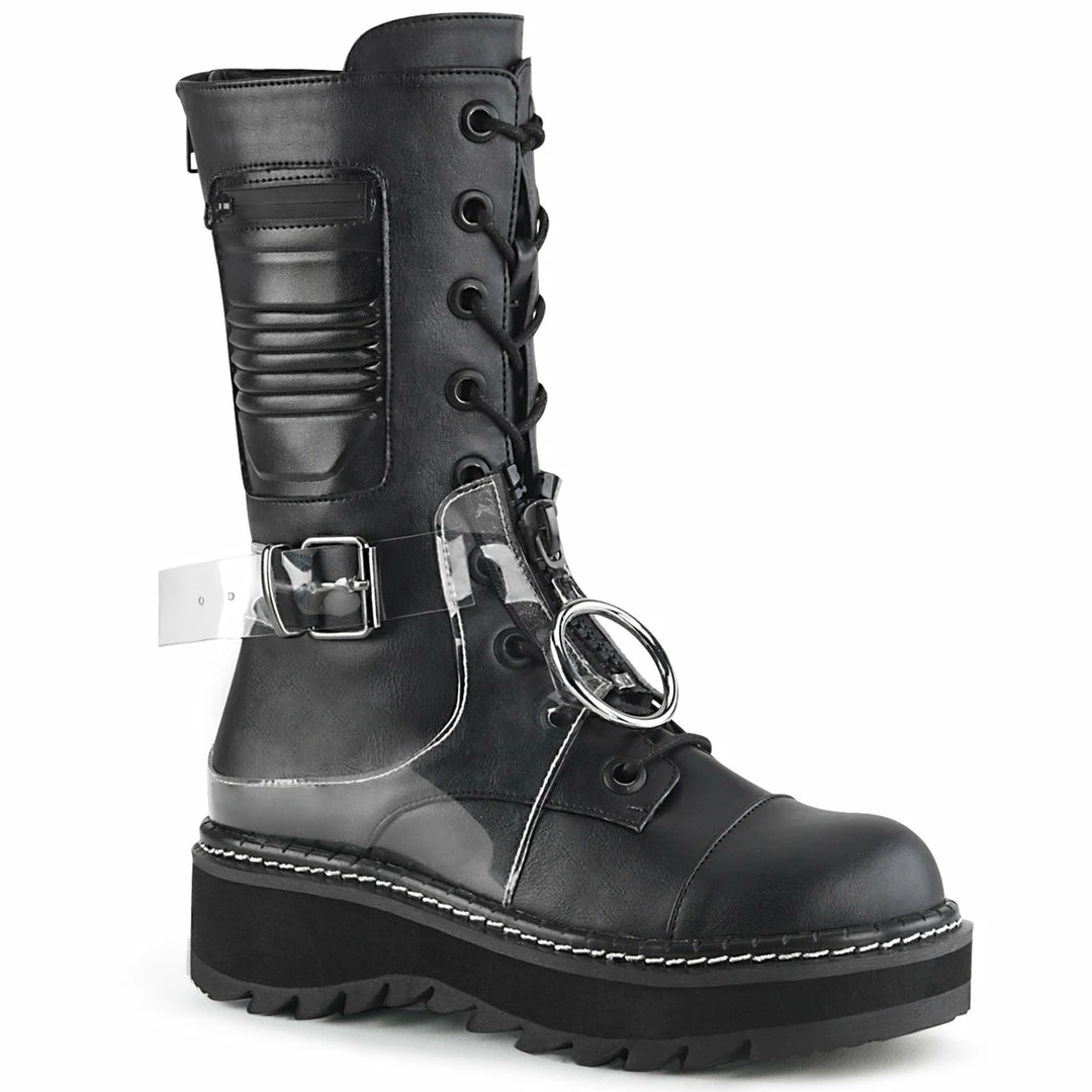 Platform Lace-Up Mid-Calf Gothic Boot Featuring Outside Zippered Pocket & Transparent Harness with Zippered Front & Oversized O-Ring Zipper Pull
