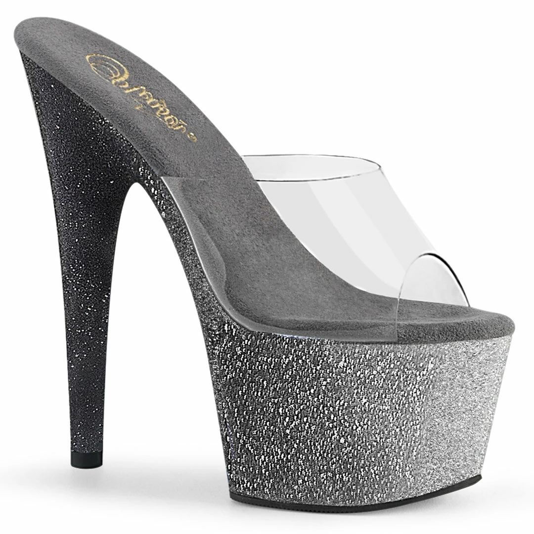 Platform Slide Exotic Dancer Sandal Featuring the Entire Platform Bottom Covered with Black and Silver Glitters for an Ombre Effect