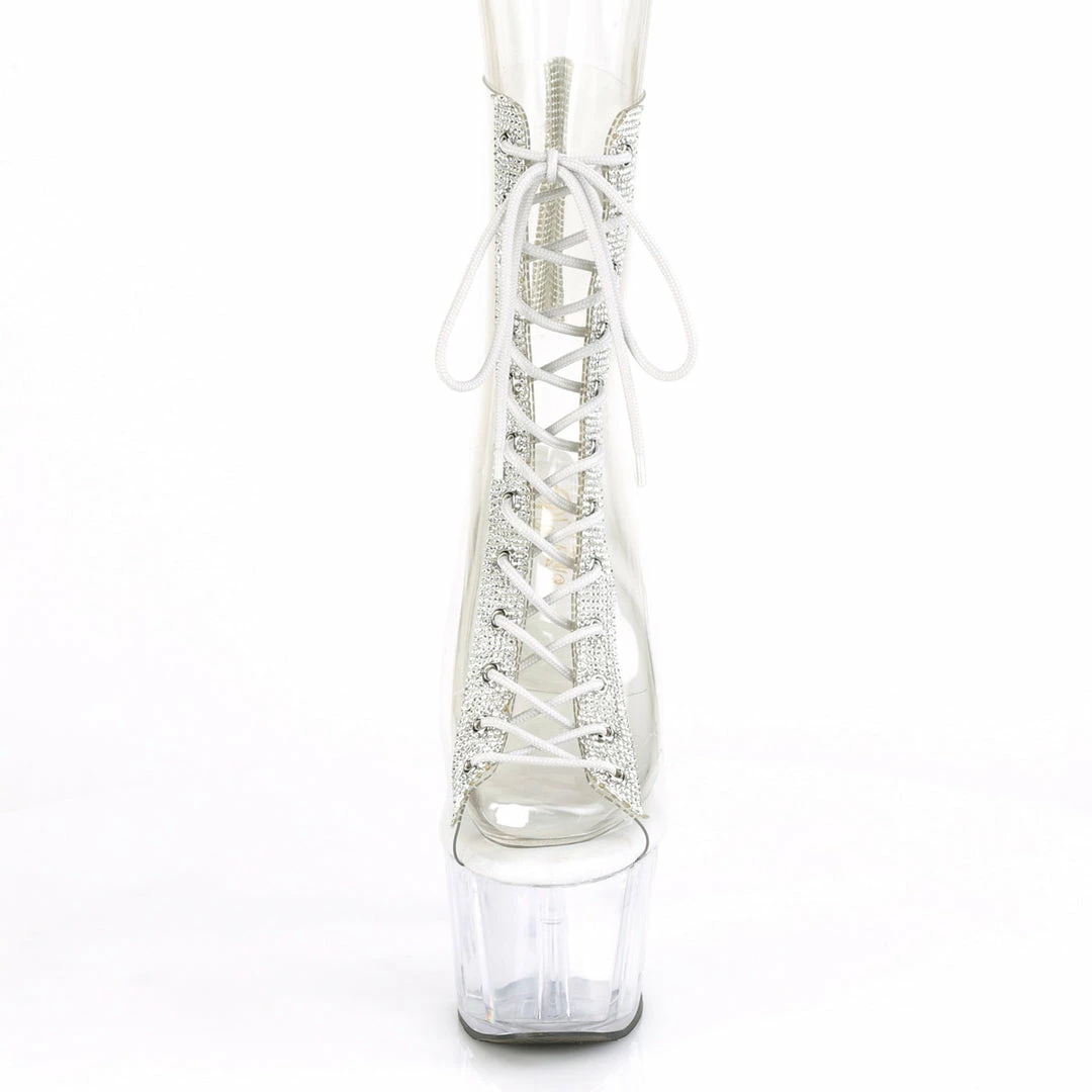 Platform Open Toe/Heel Lace-Up Front Clear Ankle High Pole Dancing Boot with Rhinestone Embellishment Along Front Panels & Back