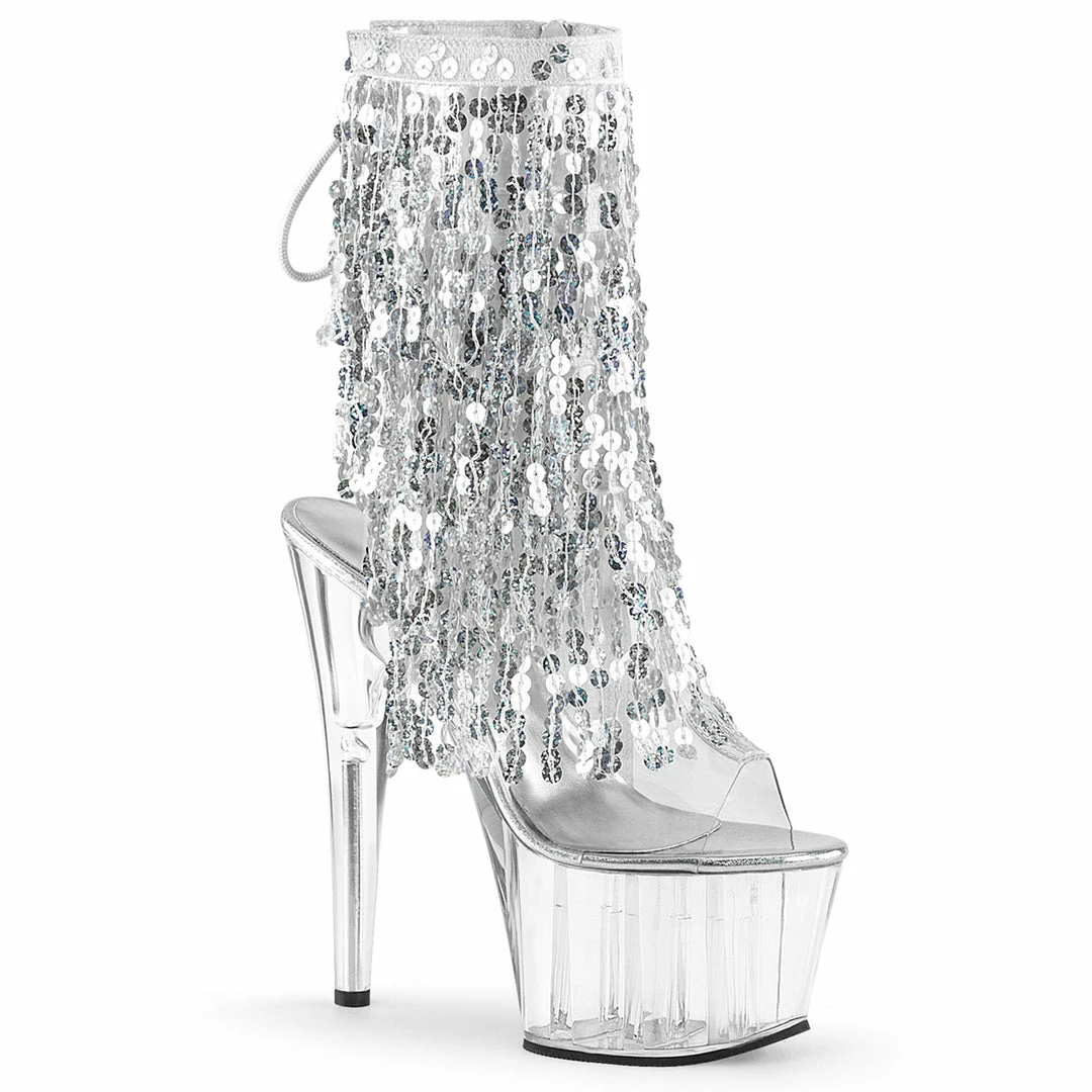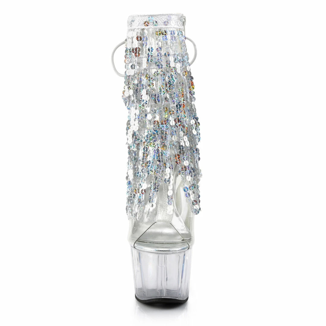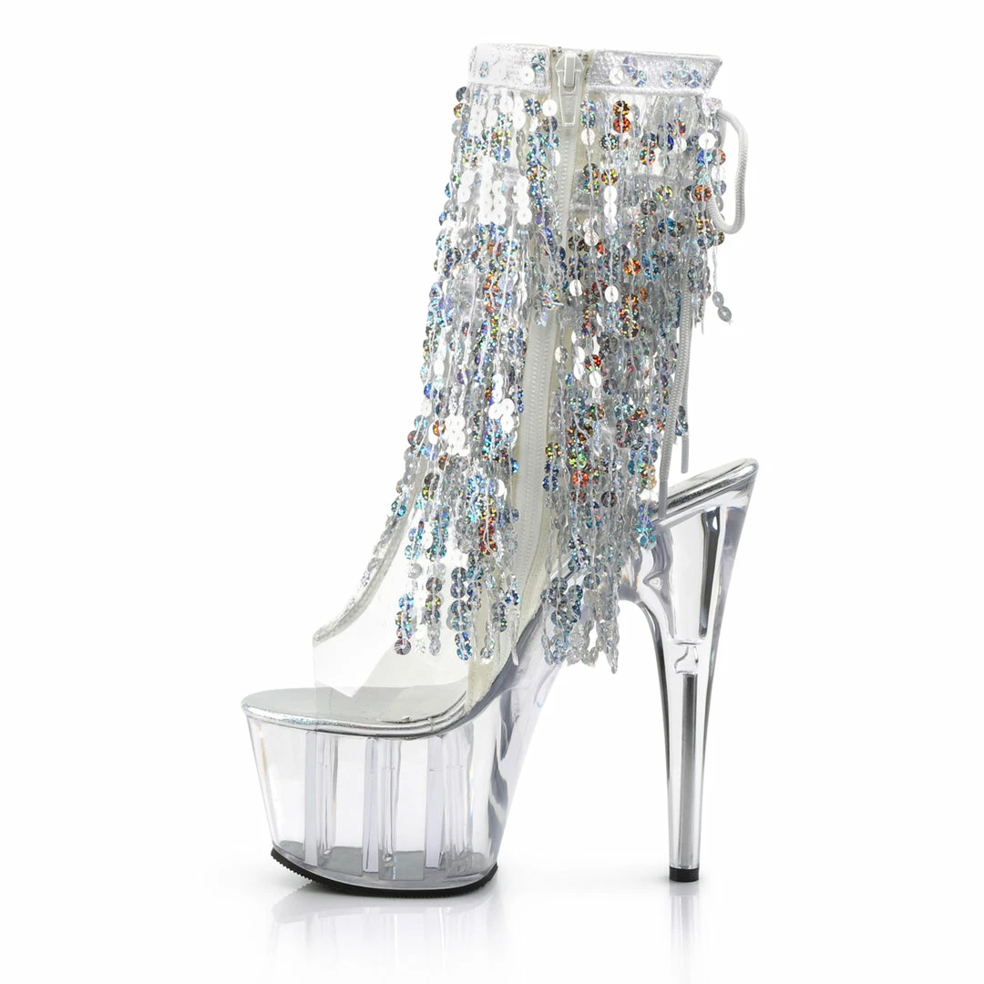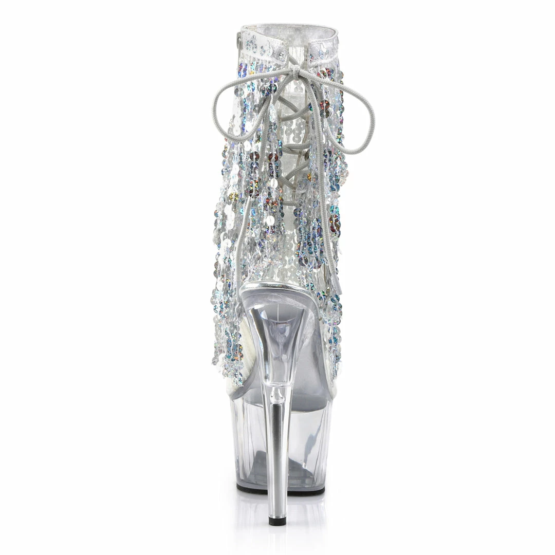 Lace-Up Back Ankle High Pole Dancing Boot Featuring 4-Layer Silver Halo Sequins Fringe
