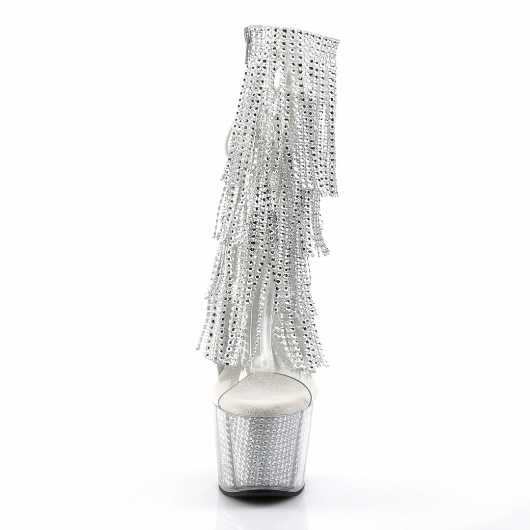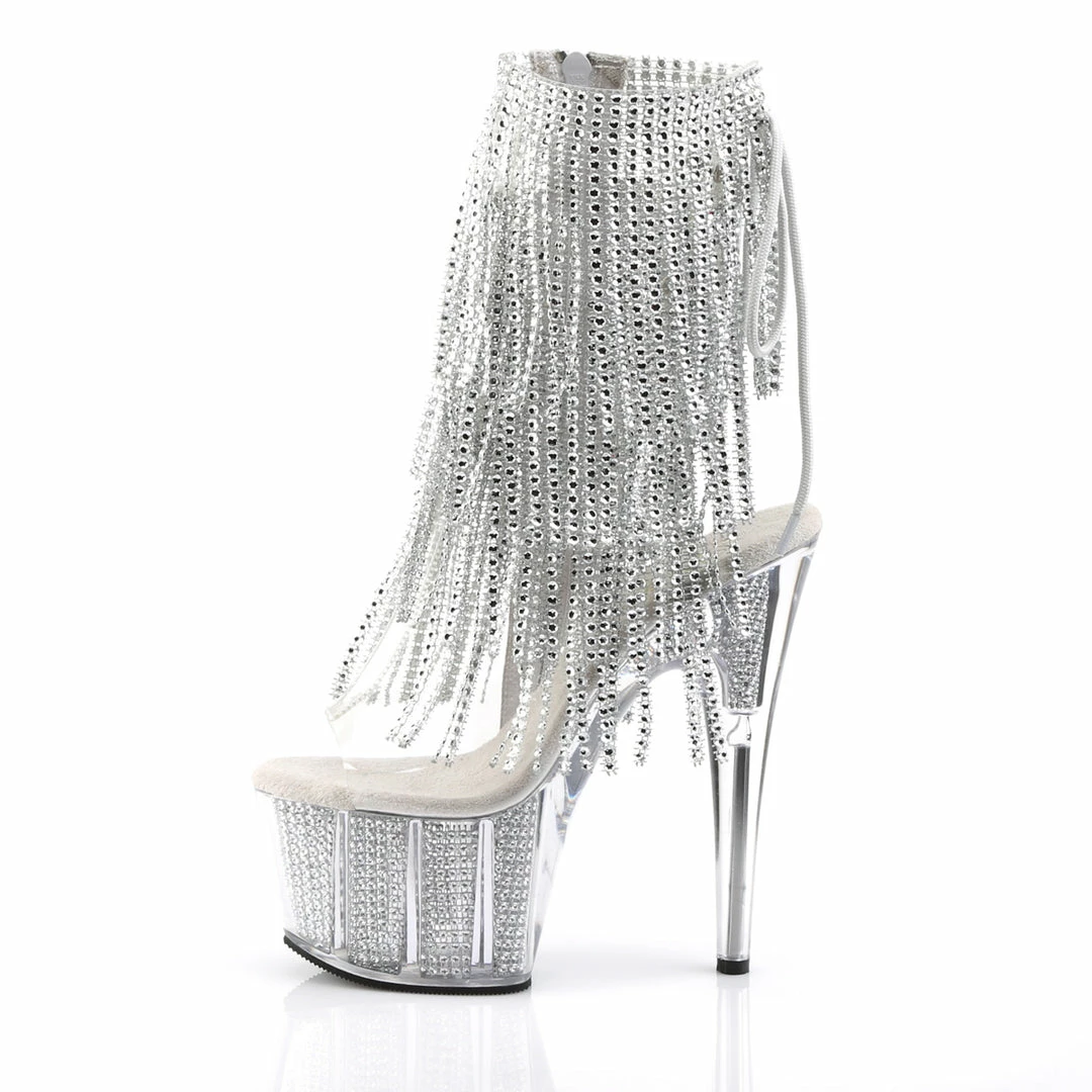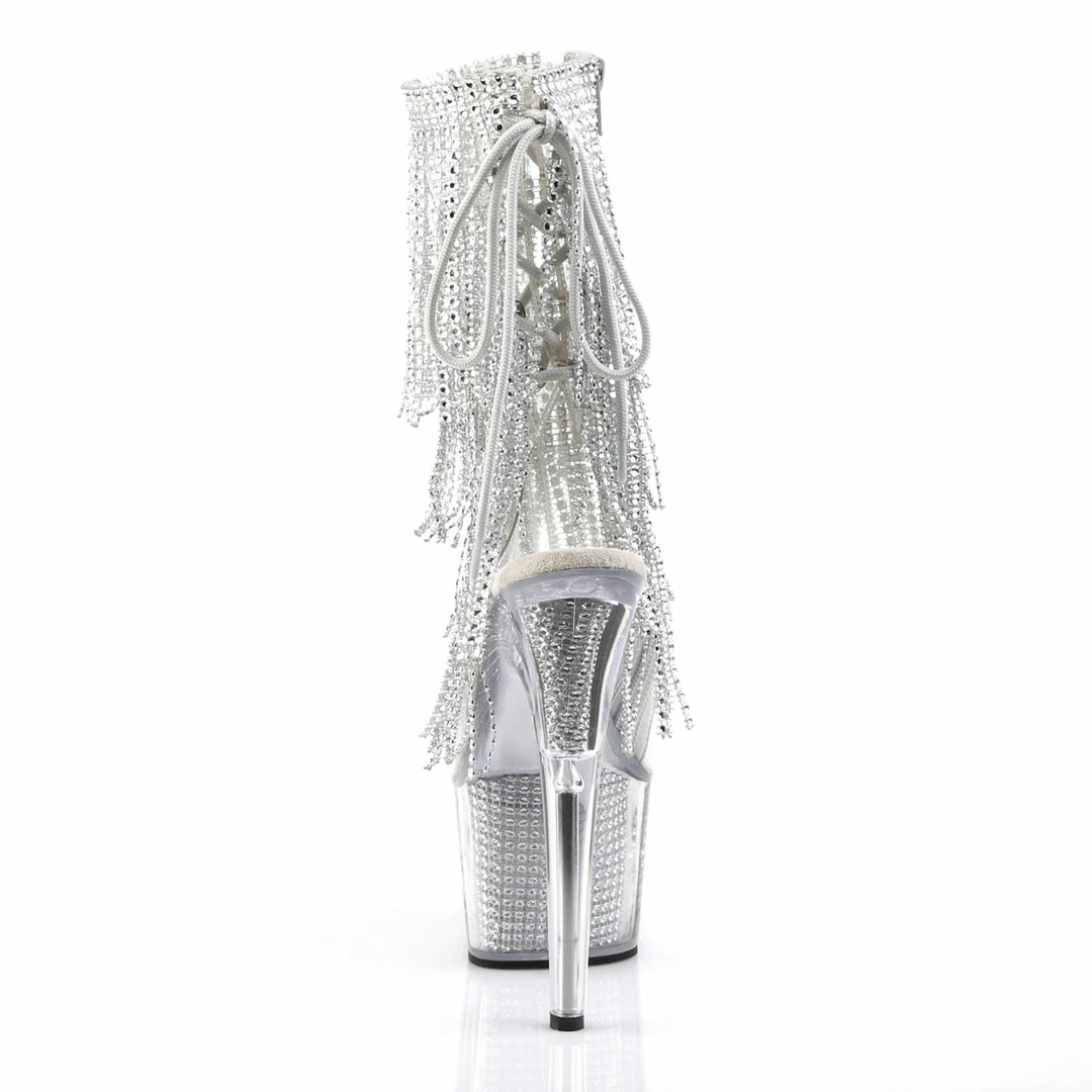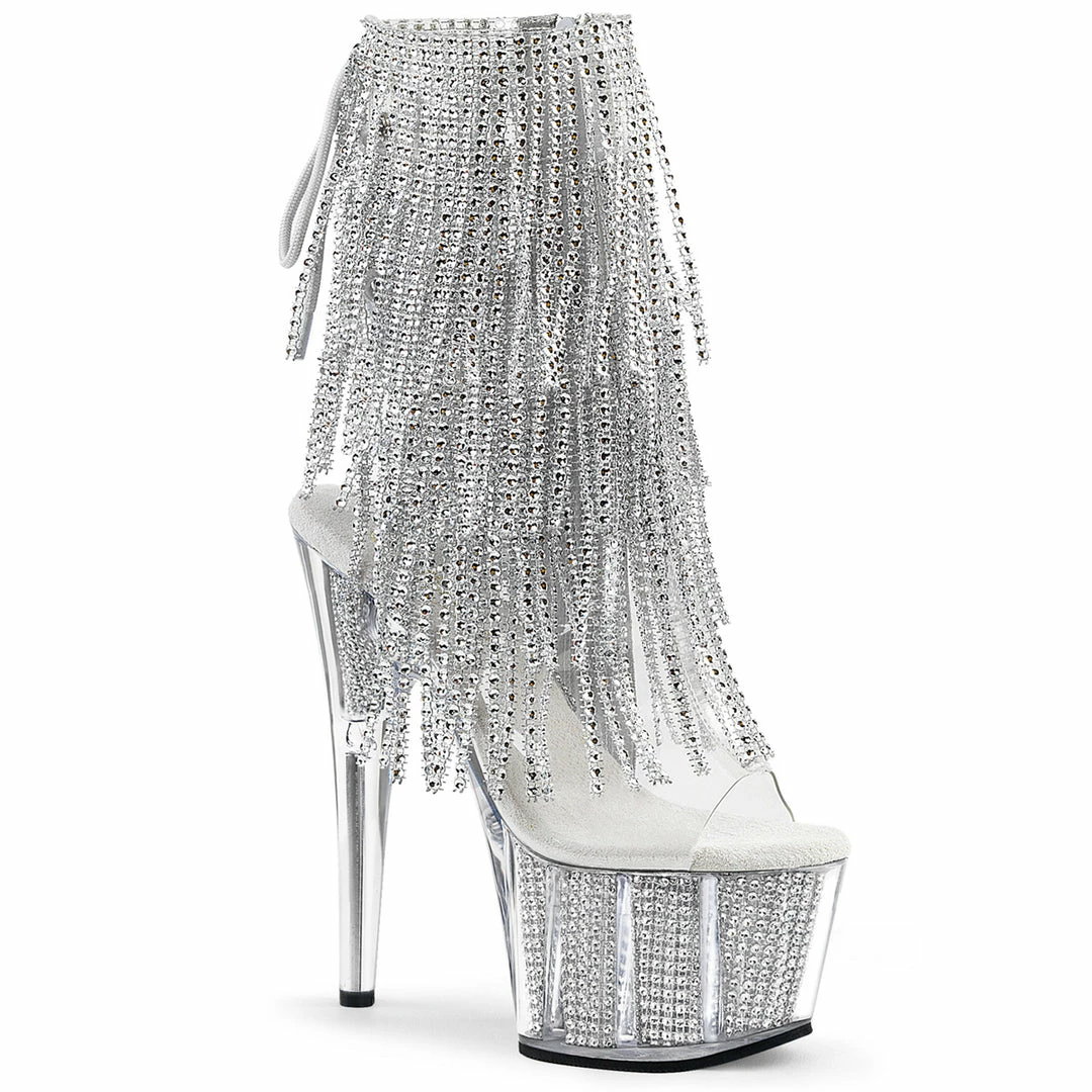Silver Platform Lace-Up Back Ankle Boot Featuring 4-Layer Fringe & Chrome Plated, Simulated Rhinestone Filled Platform