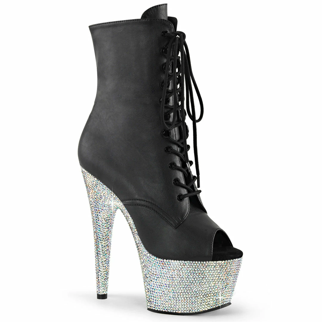 Platform Peep Toe Lace-Up Front Ankle High Stripper Boot Featuring Silver AB Rhinestones Encrusted All-Over the Entire Platform Bottom