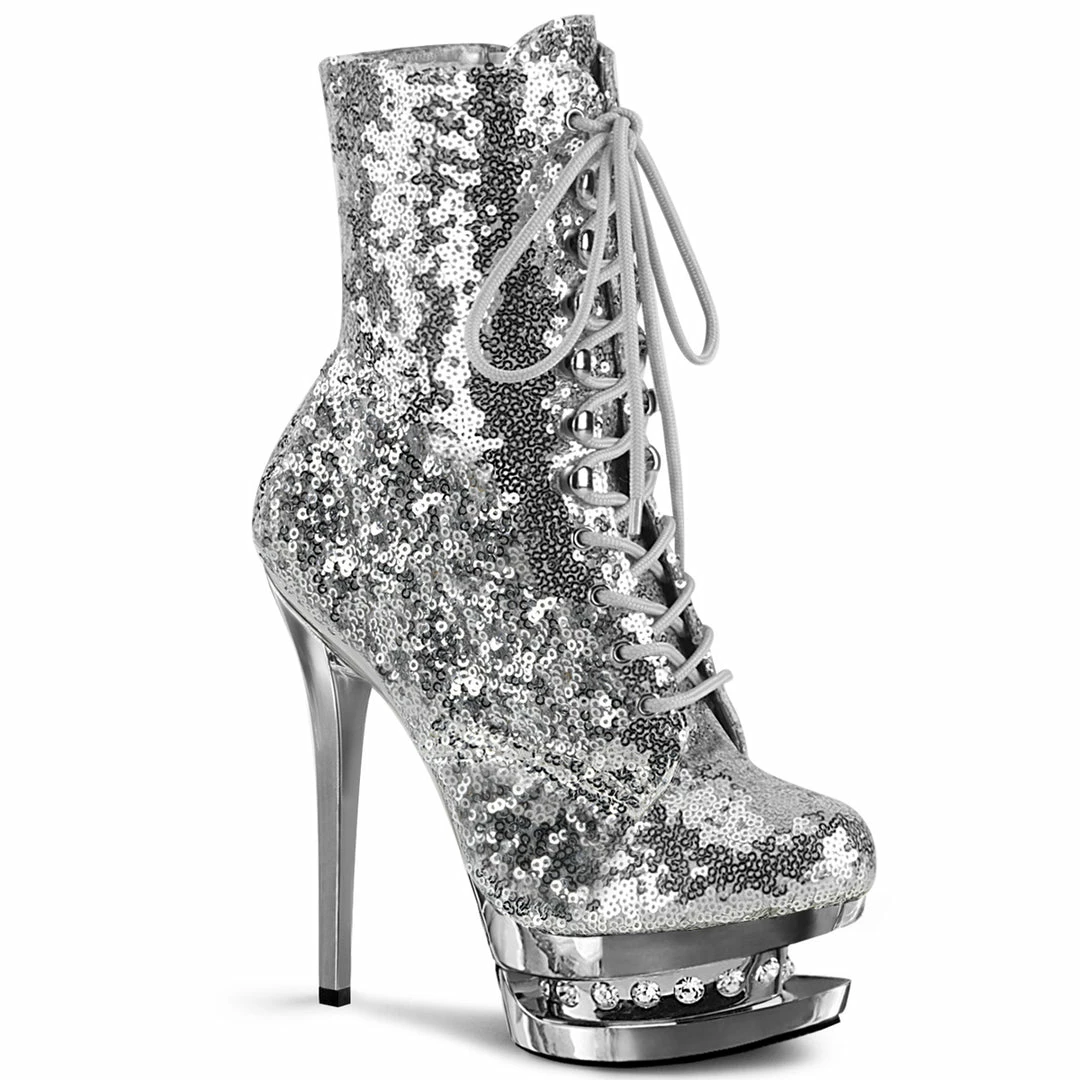 Platform Lace-Up Front Silver Sequined Ankle High Sexy Boot Featuring Rhinestone Accents in Mid Platform