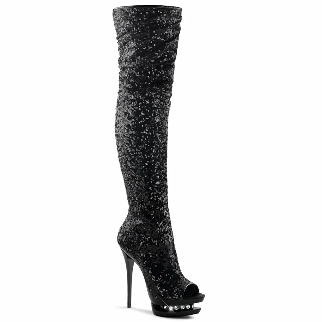 Black Sequin Platform Open Toe Thigh Boot with Rhinestone Embellishment on Inlay