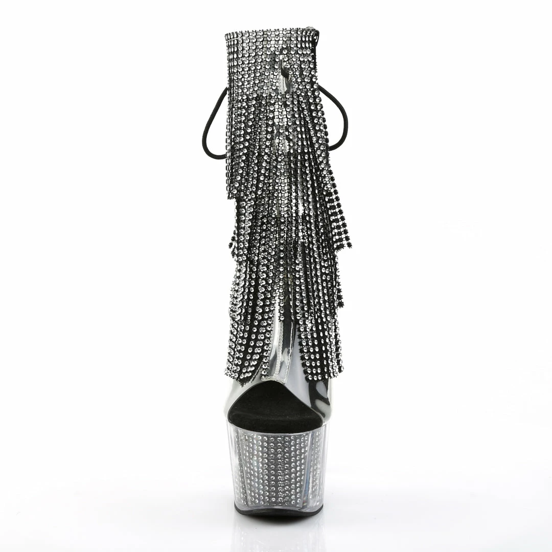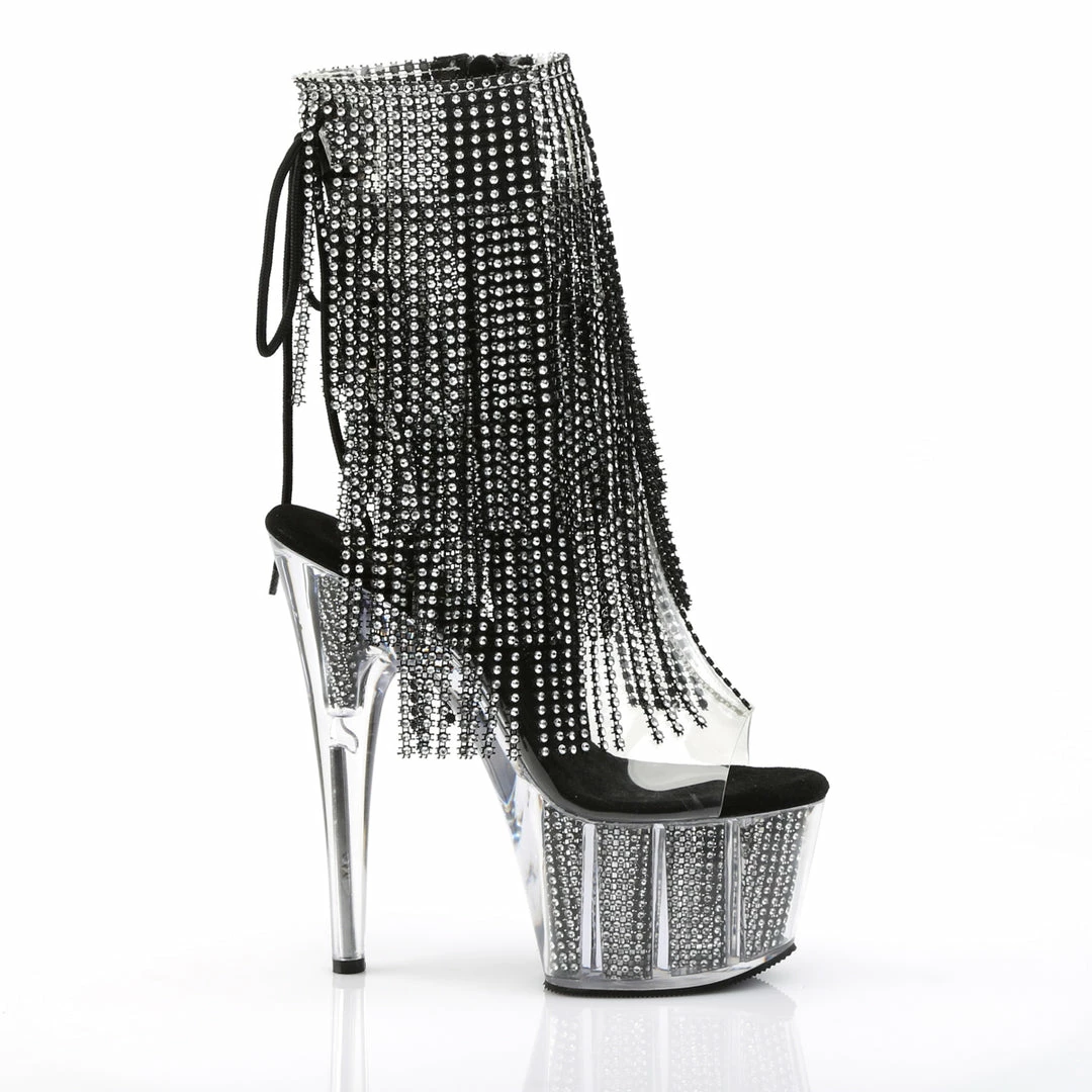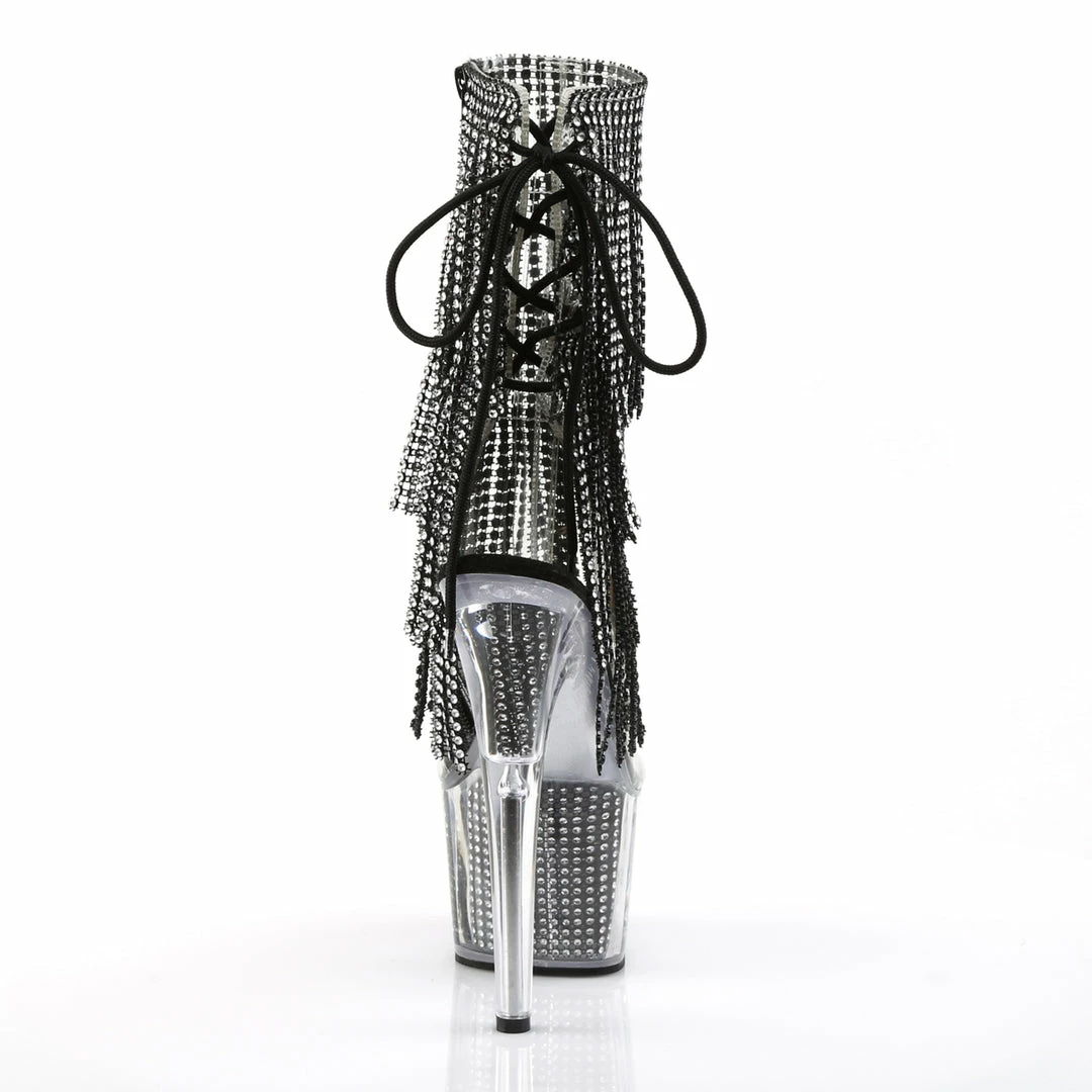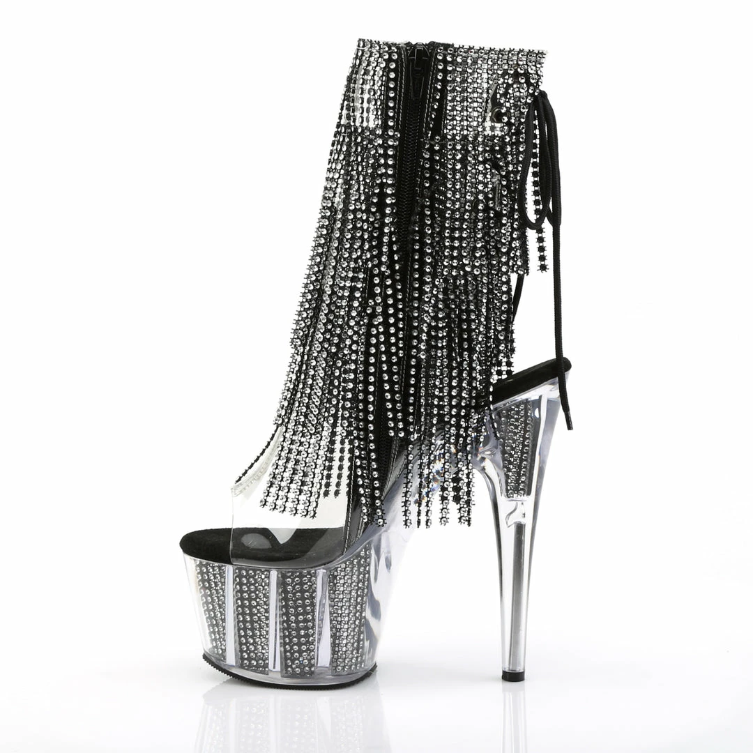 Black Platform Lace-Up Back Ankle High Stripper Boot Featuring 4-Layer Fringe & Chrome Plated, Simulated Rhinestone Filled Platform