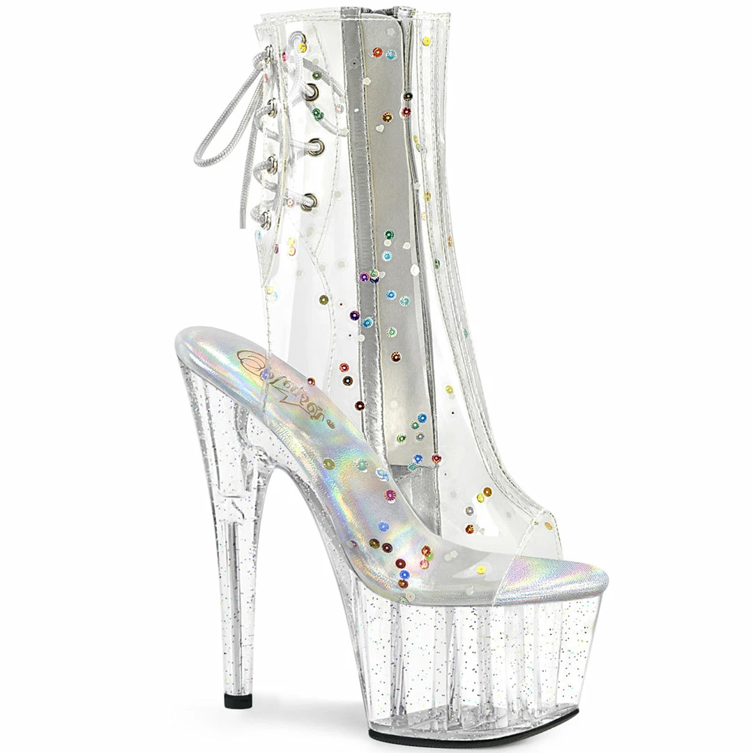 Platform Open Toe/Heel Lace-Up Back Ankle Boot Featuring Multi Sequins Embellished Upper and Mini Iridescent Glitter on the Entire Platform Bottom, Inner Side Zip Closure