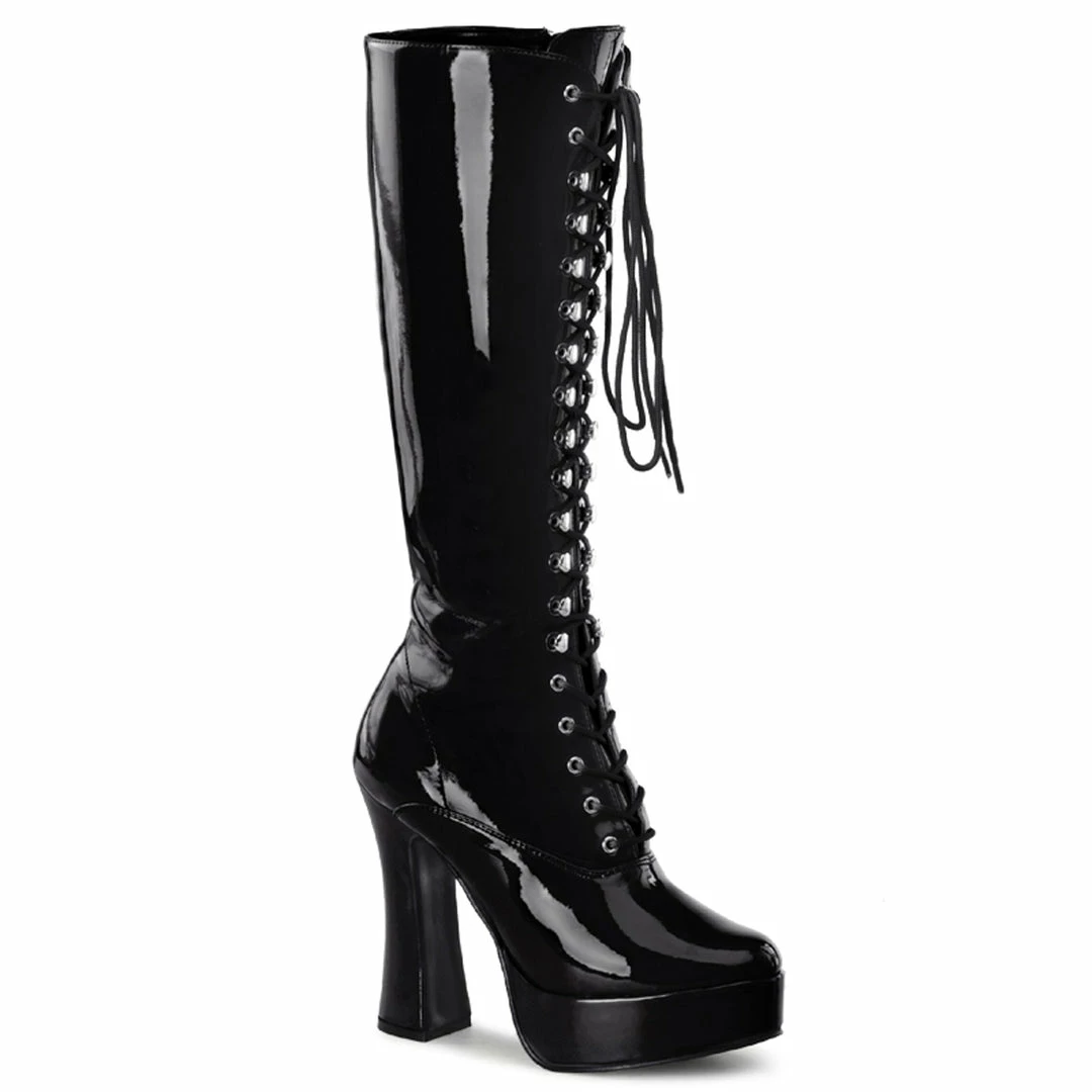 Black Patent Platform Knee High Gogo Boot with Lace Front Detail