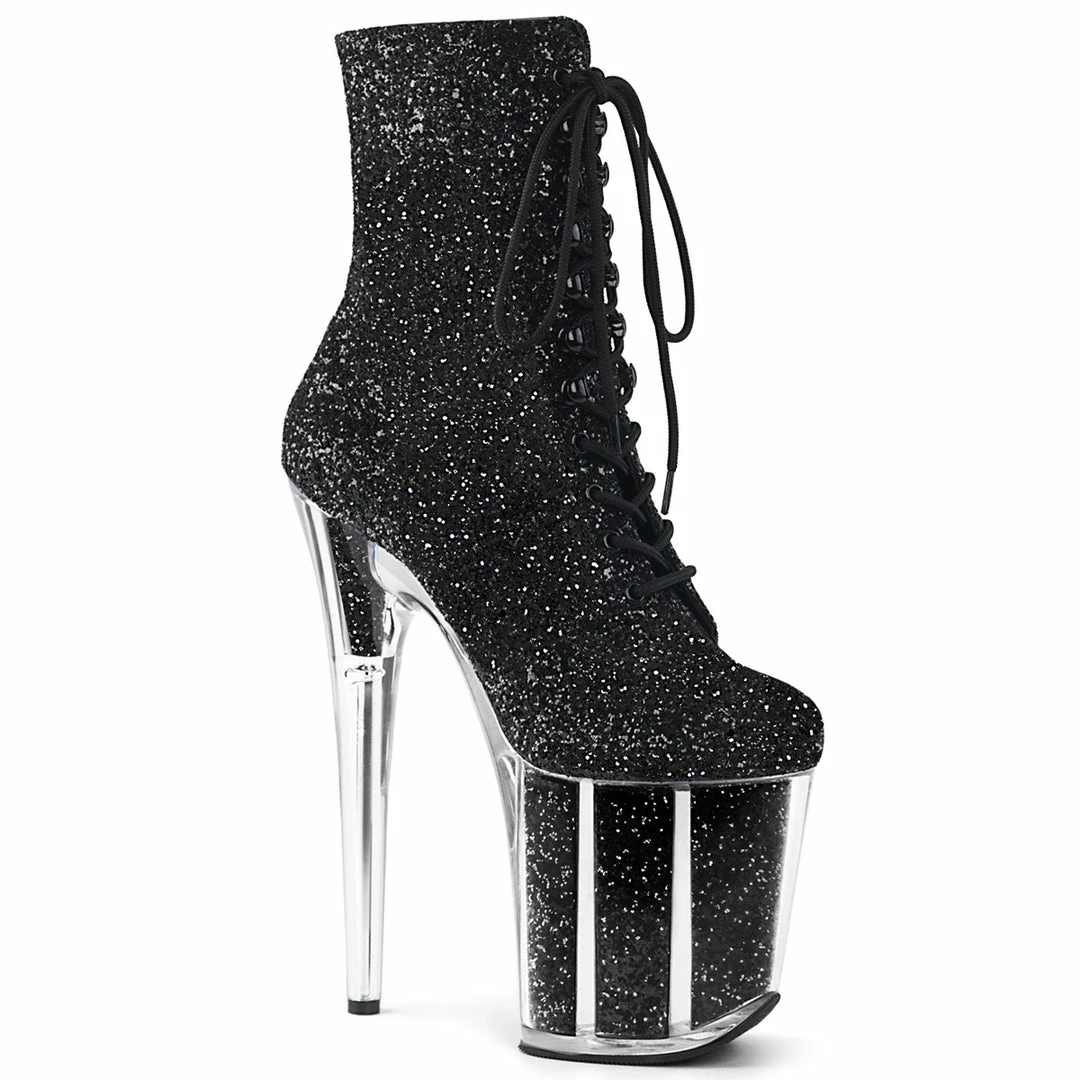 Black Glitter Filled Platform Front Lace Up Ankle High Exotic Dancer Boot