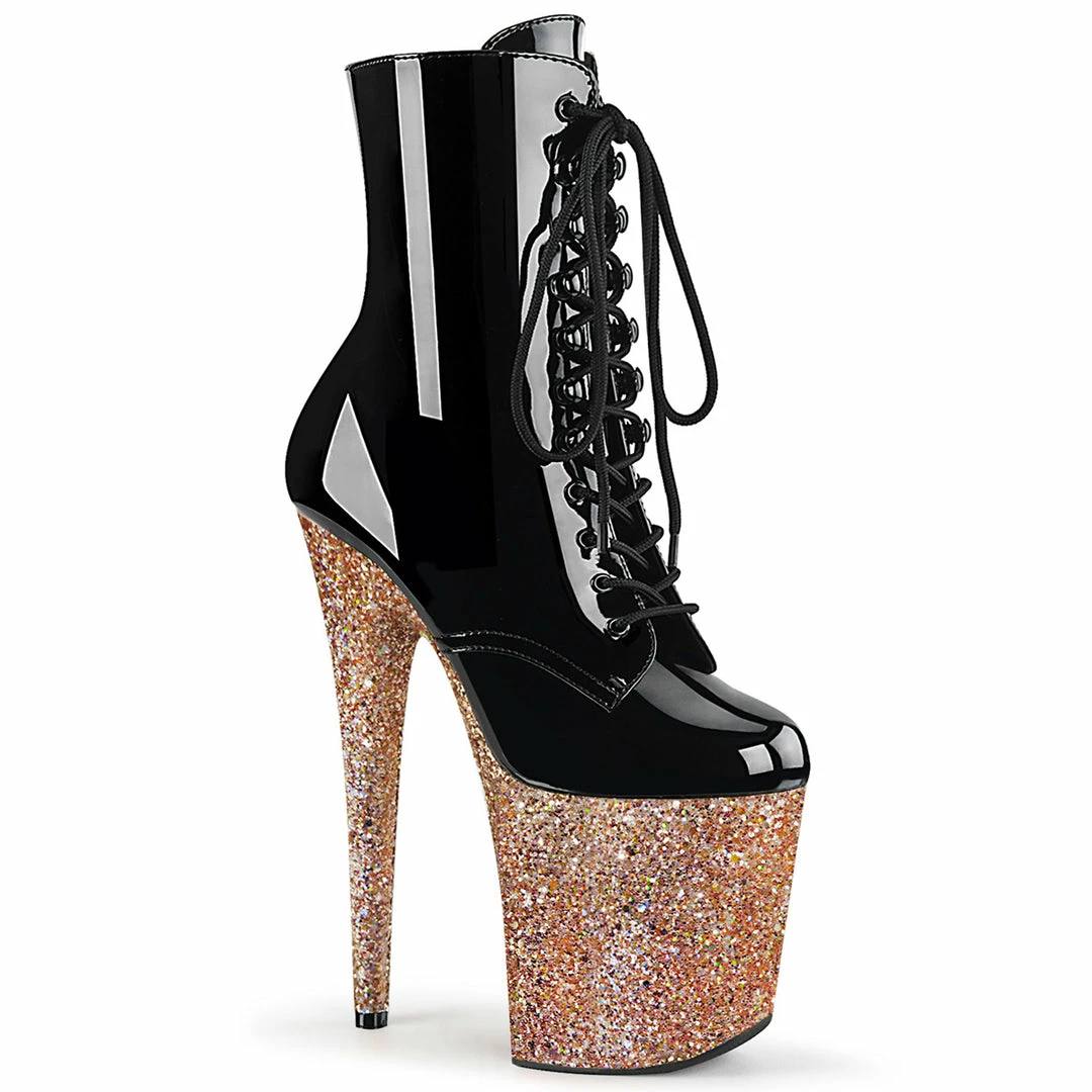 PlatformβΒ Lace-up FrontβΒ Black Patent Ankle Boot Featuring Rose Gold Holographic Glitters Covering the Entire Platform Bottom, Inside Zip