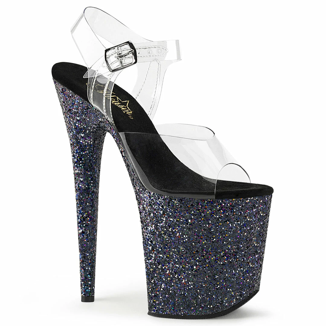Platform Ankle Strap Sandal Featuring the Entire Platform Bottom Covered with Black Multi Glitter