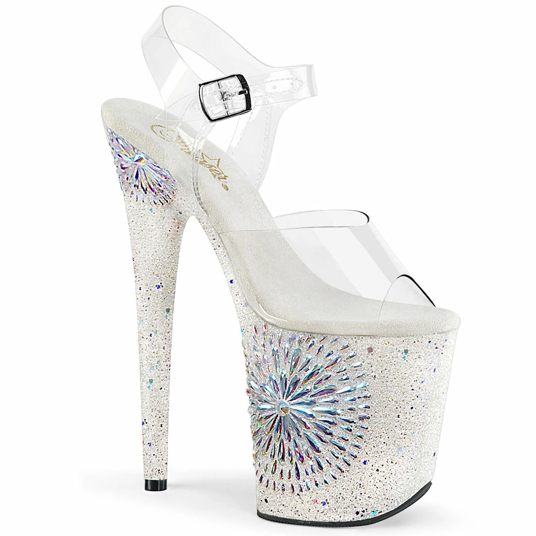 White Platform Ankle Strap Sandal Featuring Platform Bottom Encrusted with Waterdrop Shape Faceted AB Rhinestones in Circular Pattern