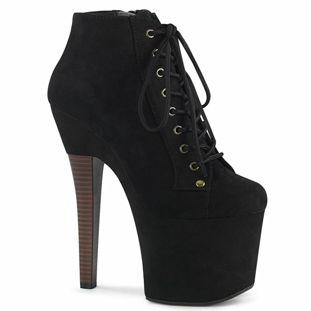 Black Faux Suede Platform Lace-Up Front Ankle Bootie Featuring Fully Wrapped Platform and Stacked Heel