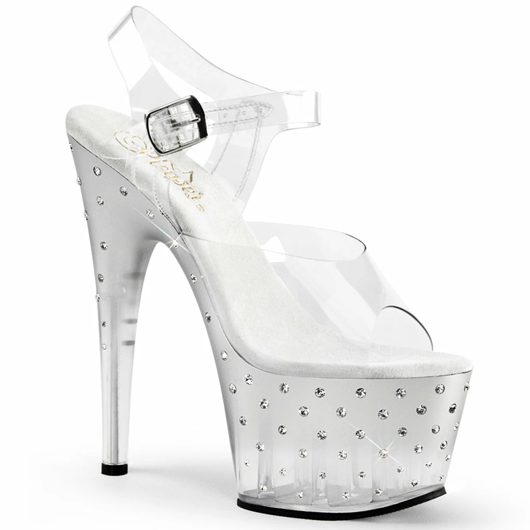 Platform Ankle Strap Sandal Featuring Multi-size Rhinestones Studded on the Outer Side of the White Tinted Platform