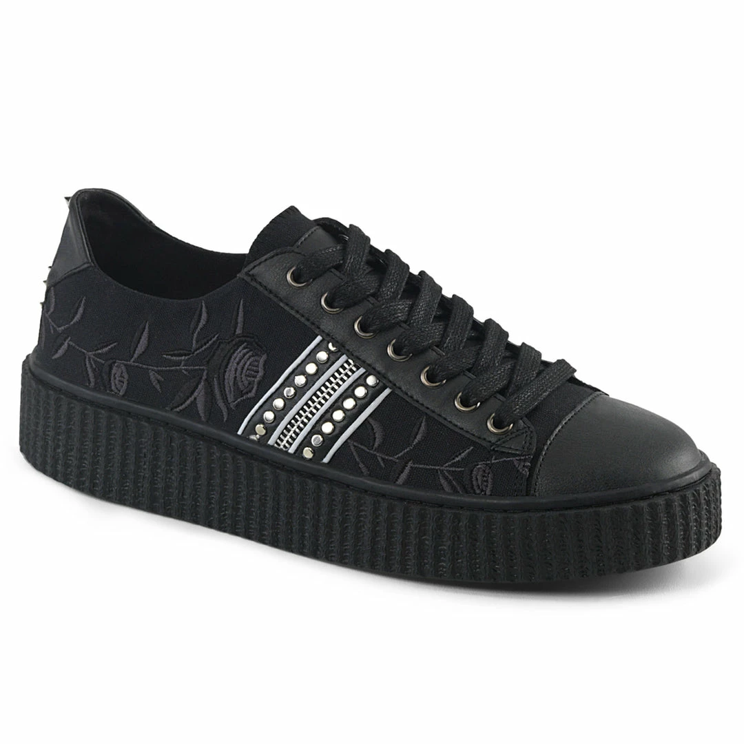 Platform Rubber Sole Low Top Round Toe Lace-Up Front Creeper Sneaker Featuring Rose Embroidery on Vamp with Stud and Zipper Trim Up the Sides