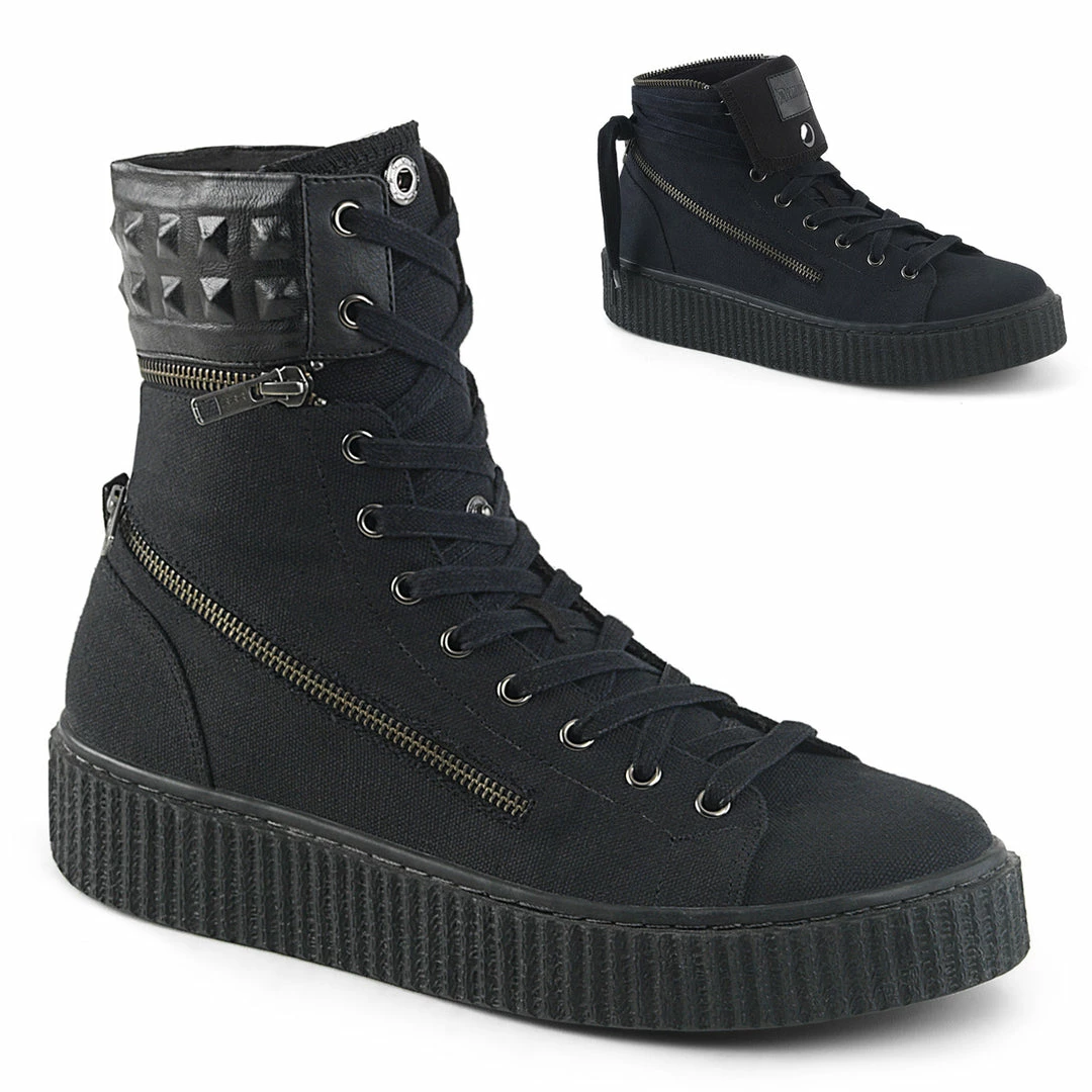 Platform Rubber Sole High Top Round Toe Lace-Up Front Creeper Sneaker Featuring Stud Embossed Removable Padded Collar, Fold Down Snap Tongue and Metal Zipper Design