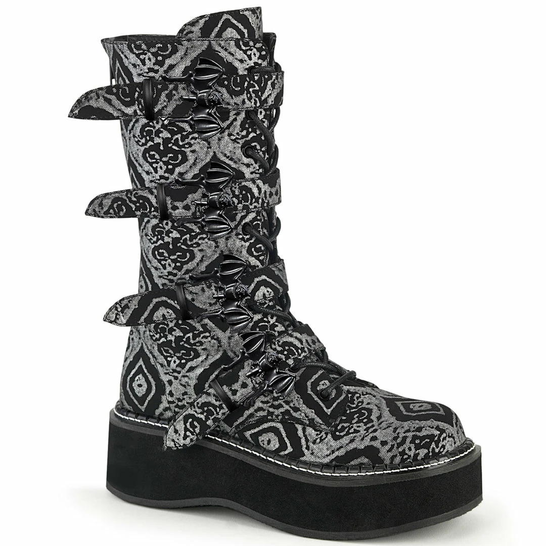 Black-Silver Faux Nubuck LeatherΓΒ Platform Lace-Up Front Mid-Calf Boot Featuring Bat Buckle Straps