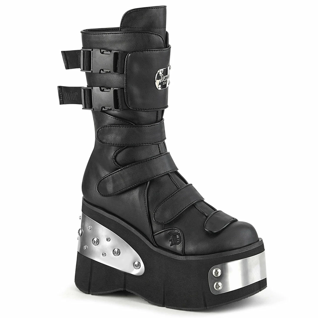 Front & Back Metal Plated Platform Strappy Mid-Calf Boot Featuring Front Shield with Branded Metal Plate Center Detail & Dual Snap Buckles and Hook & Loop Straps on the Remaining Straps