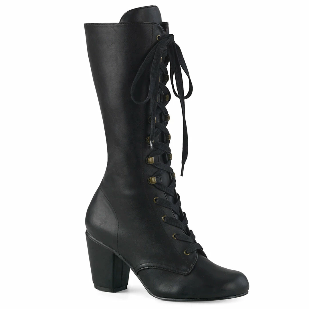 Black Vegan Leather Round Toe Lace-Up Mid-Calf Boot